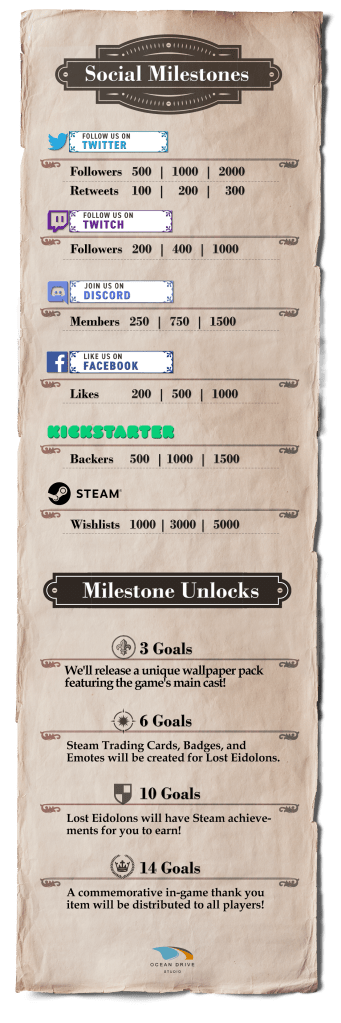 For those who had seen our previous Stretch Goals graphic before the campaign had launched, we’ve re-evaluated the milestone amounts to be more reasonable to achieve with what time we have left in the campaign. Let’s spread the word about Lost Eidolons and reach for the skies!
