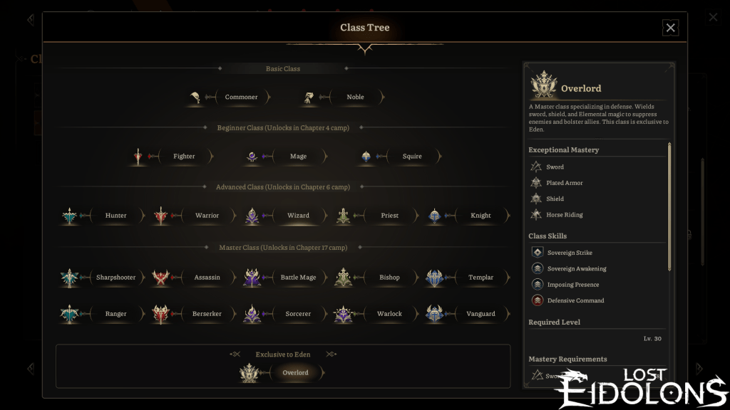 There are five different archetypes (Hunter, Warrior, Wizard, Priest, and Knight) that are split into four tiers of classes for you to choose from.