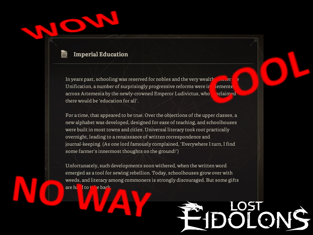 But for all the sickos out there who ENJOY reading fantasy tax policy and academic arguments about the origins of magic, we’ve got a codex with around 150 entries that unlock over the course of the game, ready for citation in the Reddit argument of your choosing.